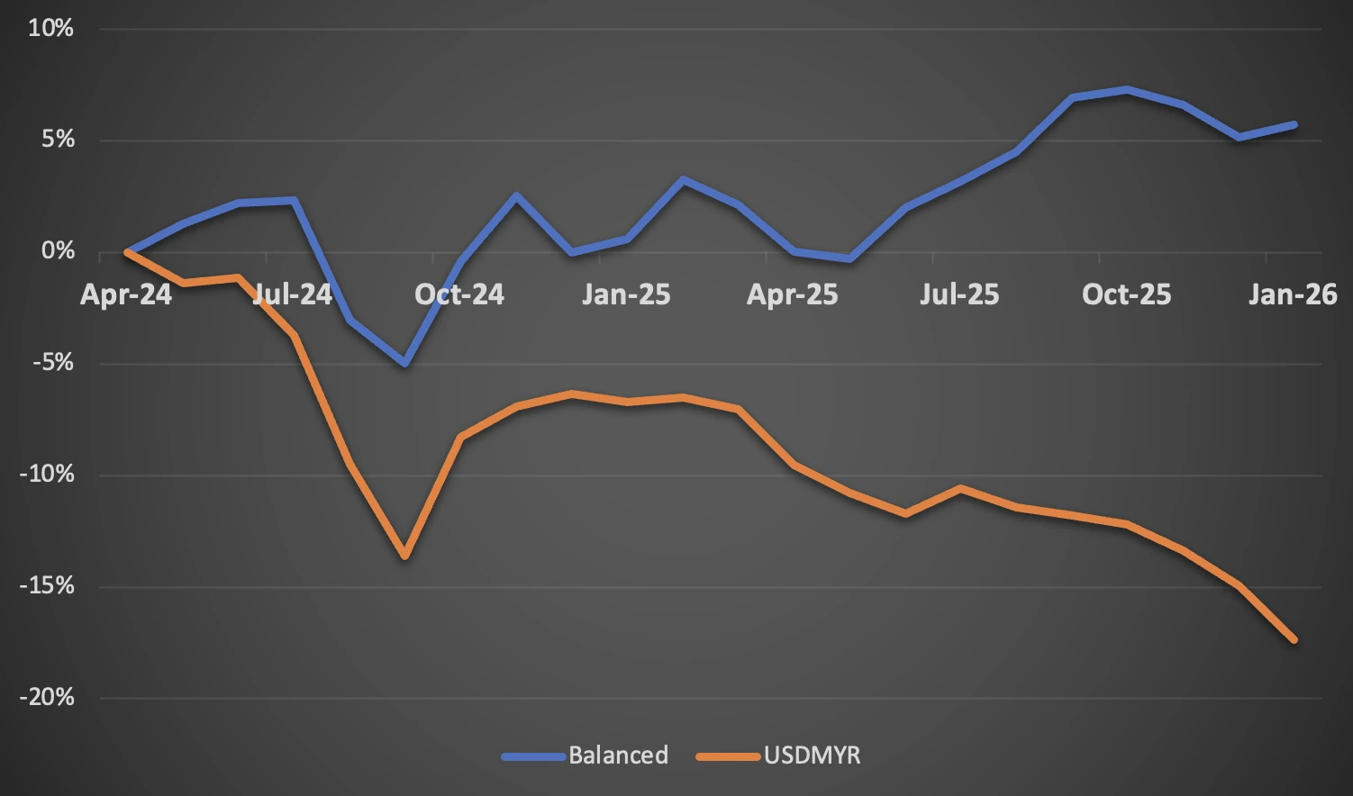 Yet for MYTHEO investors, the lived experience was very different. January turned out to be a record-breaking month. Even more striking, this resilience occurred against a backdrop of sustained US Dollar weakness. From April 2024 to January 2026, the Dollar declined by 17.4% against the Ringgit.