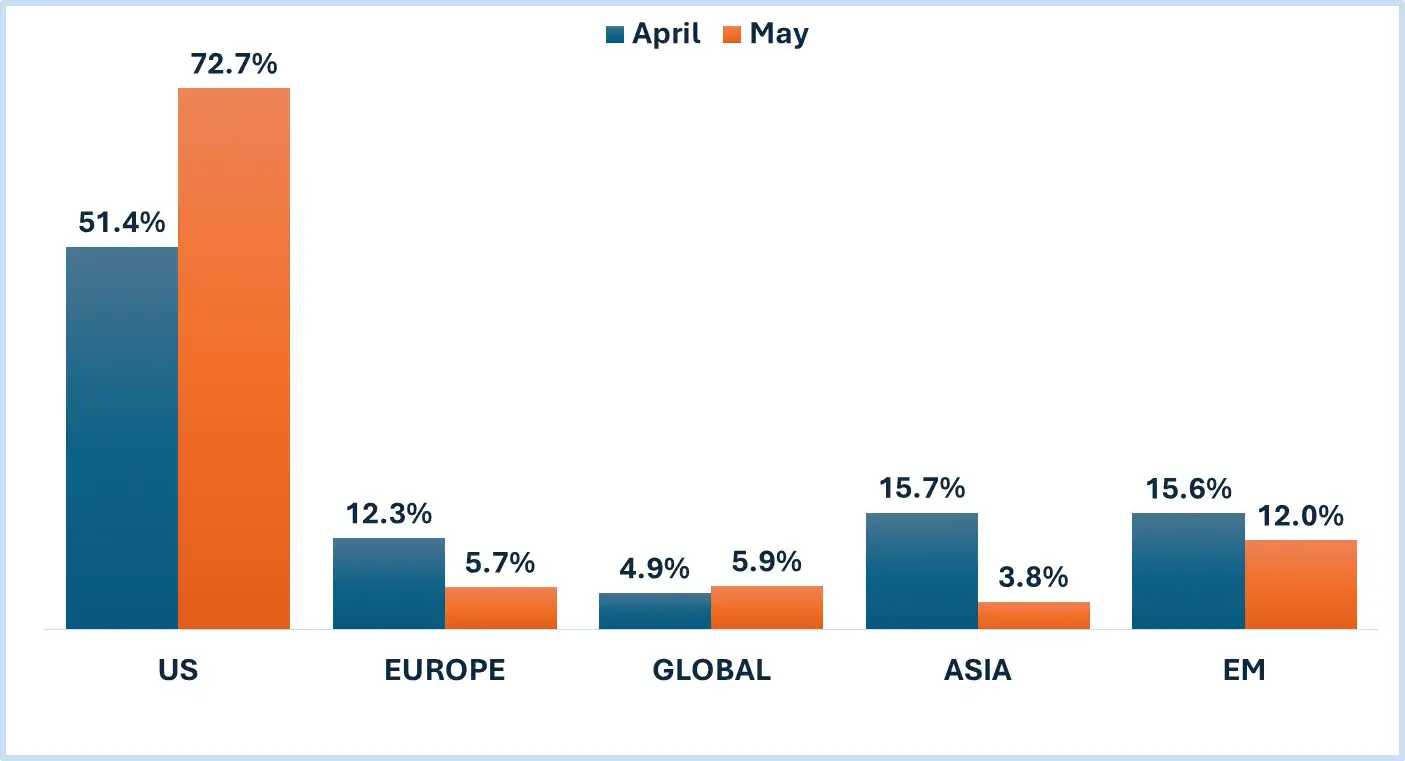 Five ETFs were removed and two new ones added, reducing the total number of holdings from ten to seven. One of the most striking changes was the substantial increase in exposure to US-listed ETFs — rising from 51.4% in April to 72.7% in May.