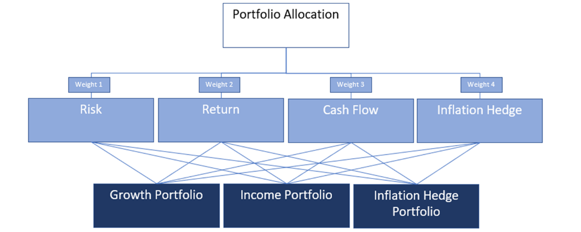 In AHP, the overall structure of multiple hierarchies is decided first. At the top of the hierarchy is the decision goal i.e. the optimal allocation across functional portfolios. The second level includes the four (4) investment elements (risk, return, cash flow, inflation hedge) and the third level includes the three (3) functional portfolios.