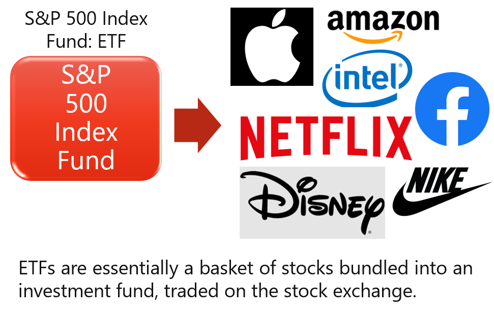 Many have asked what an ETF is when realising that MYTHEO invests into many ETFs within the 3 functional portfolios. An ETF, or better known as an Exchange Traded Fund, is basically a collection of securities – such as stocks, bonds or commodities – that often tracks an underlying index. To break it down further, I personally always prefer to refer to an ETF as a basket of stocks or securities within a particular index and to illustrate this further simplistically, I will be using the S&P 500 Index to further explain. The S&P 500 is a market-capitalization-weighted index of the 500 largest U.S. publicly traded companies. The index is widely regarded as the best gauge of large-cap U.S. equities. Apple, Netflix and Disney are examples of stocks traded on the S&P 500 Index. The S&P 500 Index Fund is an ETF that tracks the movement of the S&P 500 Index. That means that by buying the S&P 500 Index Fund ETF, you would be buying the equivalent of the basket of stocks listed in the S&P 500 Index. This can be further illustrated via the diagram below.