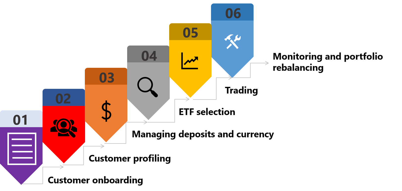 Another common question we get asked is how does MYTHEO buy its diverse range of ETFs. MYTHEO mostly invests in ETFs listed in the US due to the various types of ETFs available. MYTHEO selects ETFs that are most suitable for customers to be included in the investment universe. As many of MYTHEO’s ETFs are listed in the US, this does not mean that MYTHEO only owns US ETFs, as there are ETFs that invest in other countries or regions such as the iShares MSCI Singapore which invests purely into Singapore or the Market Vectors Emerging Markets ETF that invests into a variety of Emerging Markets. As a licensed Digital Investment Management service by the Securities Commission, MYTHEO is able to access these ETFs via an Online Broker, and the process of trading, rebalancing and even selling of a particular ETF is handled by our proprietary algorithm. This end-to-end process is further depicted by the diagram below indicating that MYTHEO is able to handle everything for the investor from start to finish.