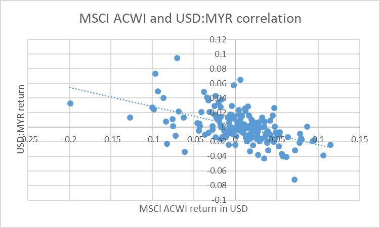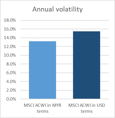 This means that movements in global equity prices and USD:MYR tend to offset each other and hence the annual volatility of portfolio returns in MYR is actually lower than the volatility of the returns in USD and so hedging is likely to give you higher volatility in returns.