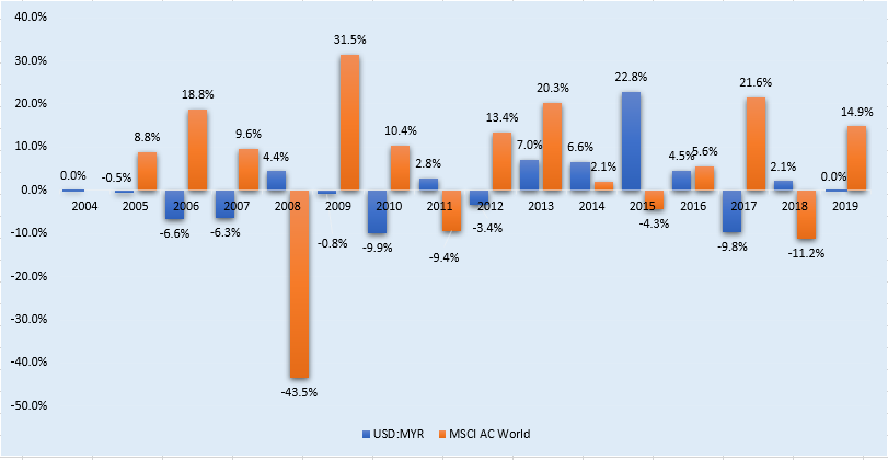 Chart 3: Annual Returns of MSCI All Country World Index in USD and USD:MYR