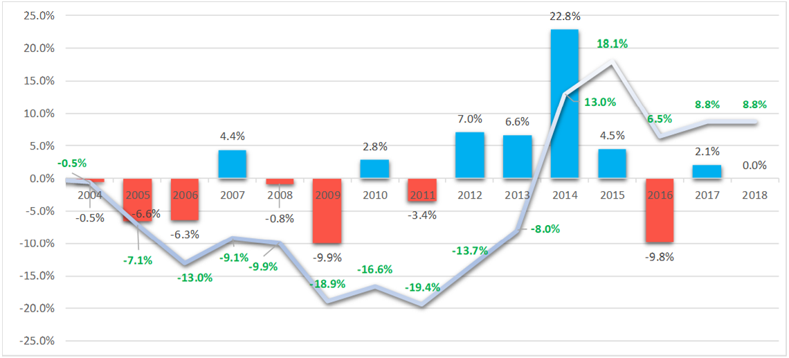 Chart 2: Annual and Cumulative Performance of USD:MYR from 2004 to 2018