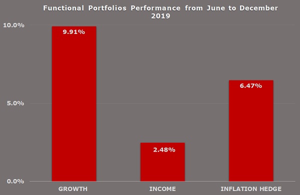 It must be noted that, the actual portfolio returns to the investors is the combined weighted return from the allocation to each functional portfolio. For example, if an investor allocates the investment equally: 33.3% in Growth, 33.3% in Income and 33.3% in Inflation Hedge, the actual portfolio return is (33.3% x 9.91%) + (33.3% x 2.48%) + (33.3% x 6.47%) = 6.29% over a 7-month period from early June to December 2019.