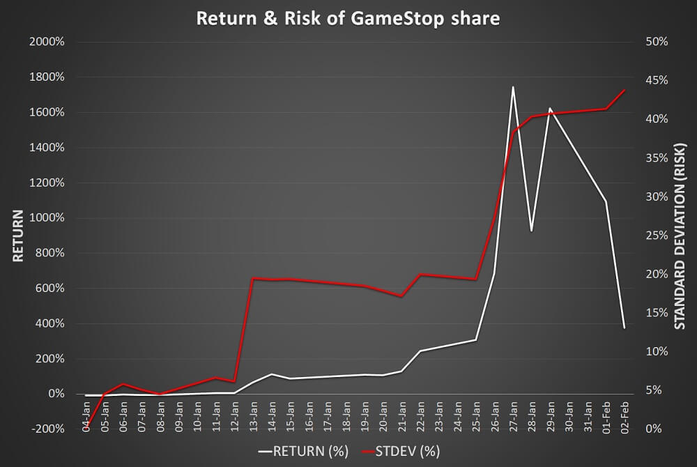 How did all this happen? From the chart above, we see that when the share price of GameStop surged, its standard deviation also rose. A high standard deviation indicates that it is getting riskier to hold on to the stock and the possibility of a share price correction has increased substantially. That was precisely what happened at the end of the month, in just a few days, the share price of GameStop plunged by more than 80%. Many investors were caught unprepared and it was impossible to avoid the losses, given how quickly the share price had reversed.