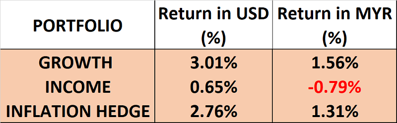In MYR, the Growth and Inflation Hedge portfolio rose by 1.56% and 1.31% respectively. The Income portfolio however declined by 0.79%.
