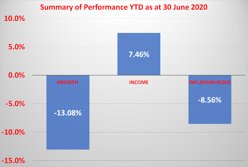 It must be noted that, the actual portfolio returns to the investors is the combined weighted return from the allocation to each functional portfolio. For example, if an investor allocates the investment equally: 33.3% in Growth, 33.3% in Income and 33.3% in Inflation Hedge, the actual portfolio return is (33.3% x -13.08%) + (33.3% x7.46%) + (33.3% x -8.56%) = -4.73% over a six-month period from January to June 2020.