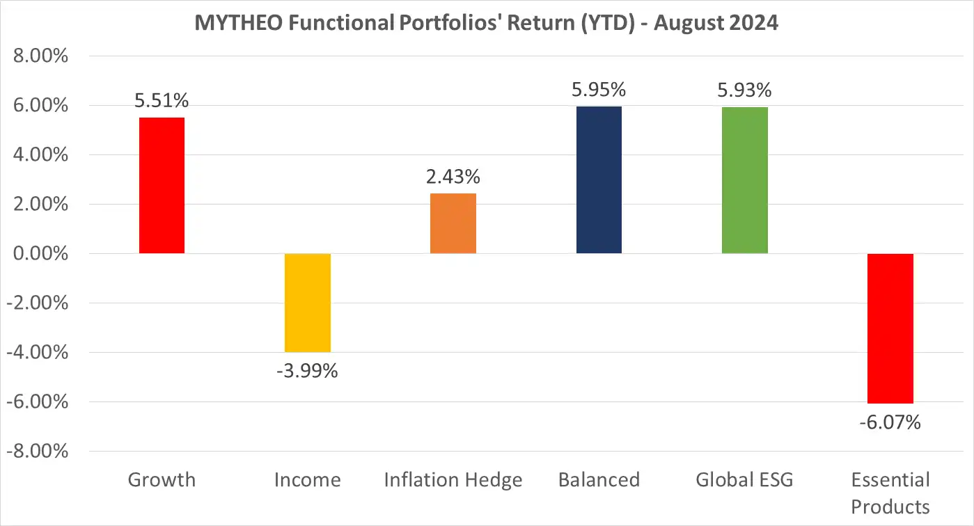 In this monthly report, we will assess the performance of MYTHEO’s portfolios in light of the financial market developments in August 2024.