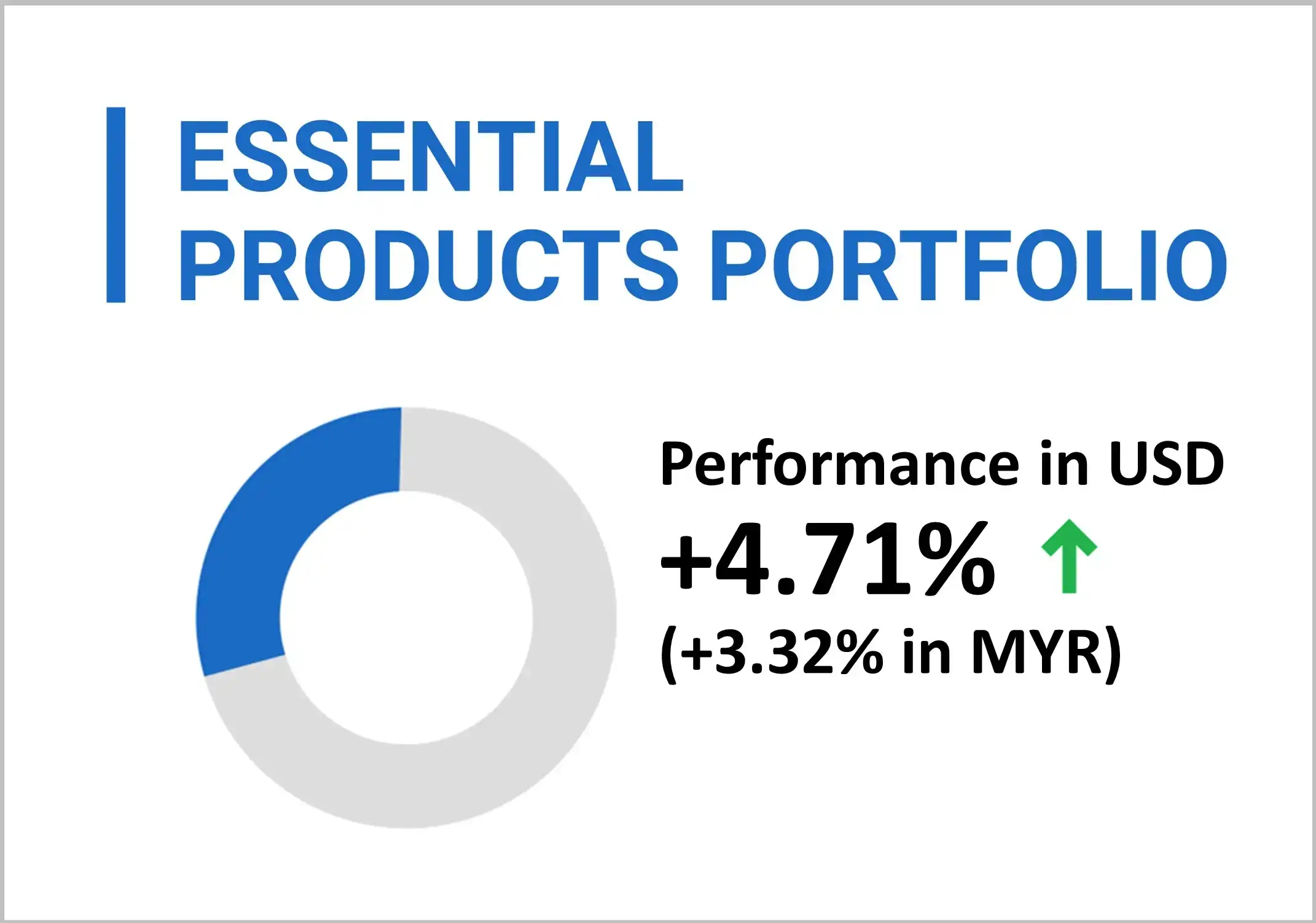 MYTHEO’s Essential Products portfolio is up by 4.71% (+3.32% in MYR) in December 2023.
