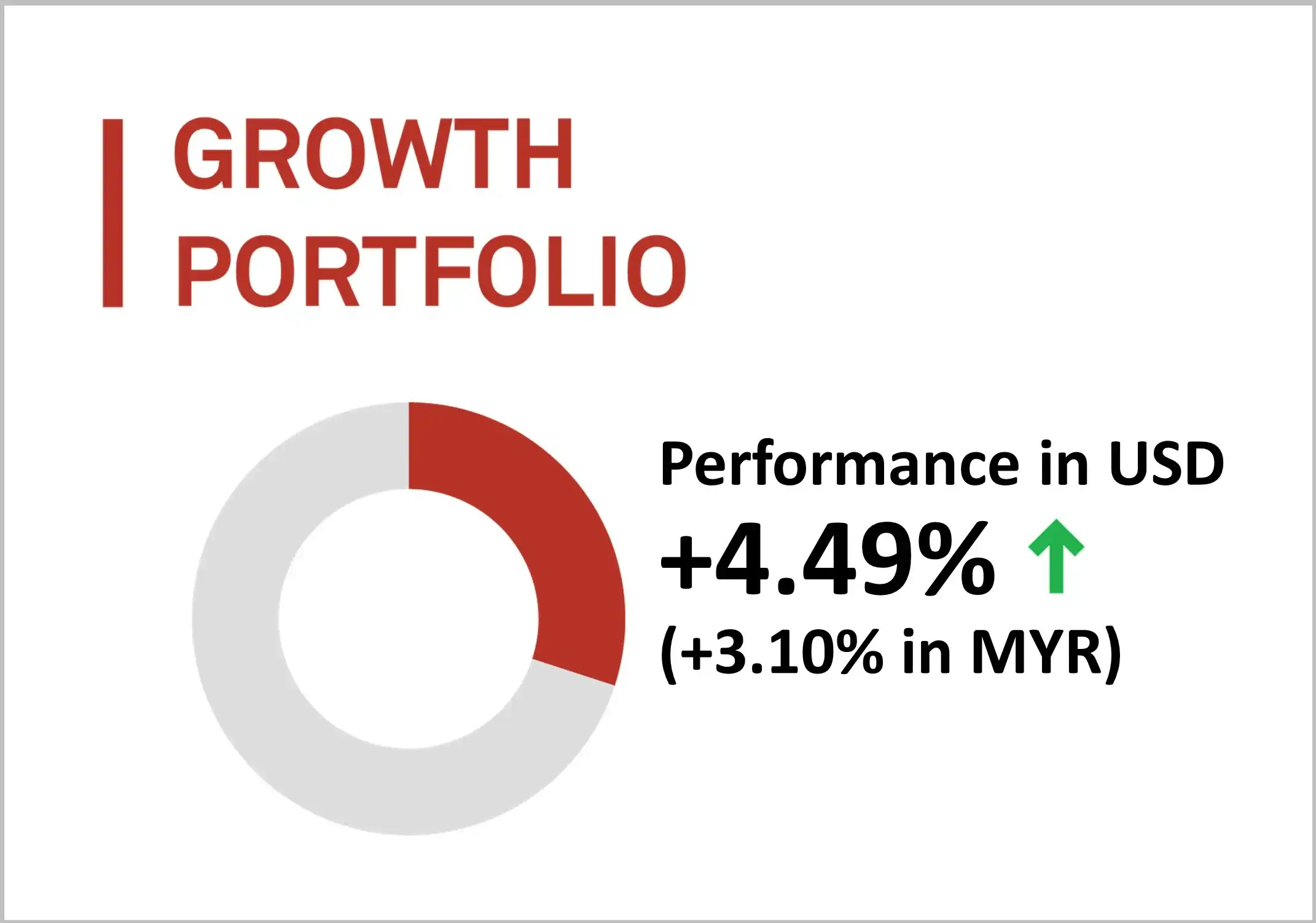 For example, if an investor allocates 30% of their investment in Growth, 45% in Income and 25% in Inflation Hedge, the actual portfolio return in MYR for December is +2.06% [(30% x 3.10%) + (45% x 1.49%) + (25% x 1.85%)]