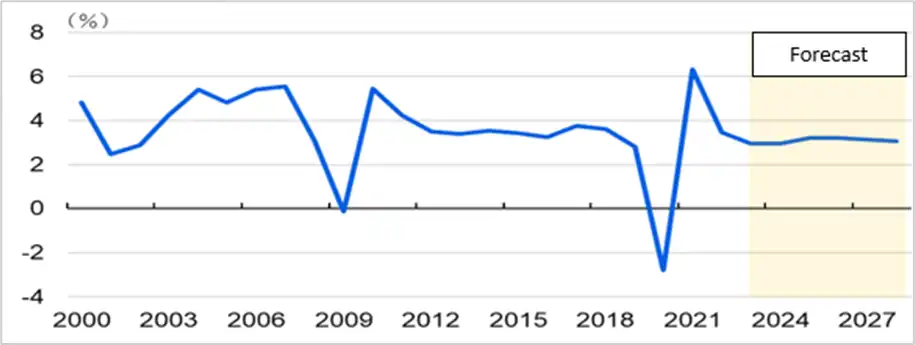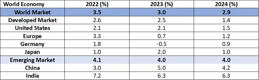 The graph below shows the global GDP growth rate released by the International Monetary Fund (IMF). The global growth rate is expected to be around 3% over the next few years, at 3.5% (2022) and 3.0% (2023*forecast).