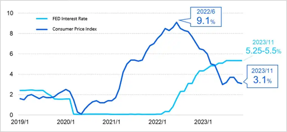 The inflation rate in the United States peaked at 9.1% in June 2022 and gradually declined to 3.1% in November 2023.