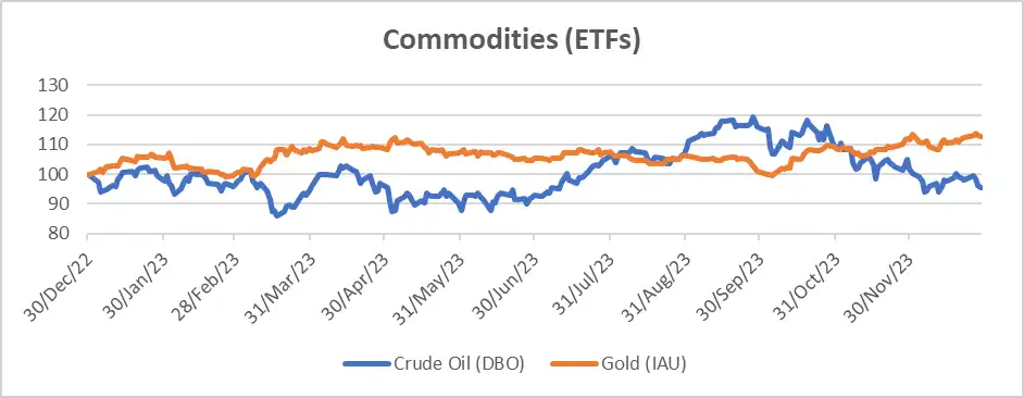 The chart below shows the performance of the stock and commodity markets in 2023. Stocks market in the U.S. and Europe have been depressed for much of the year but have risen strongly since the late October in the growing belief that the interest rate cycle should have peaked.