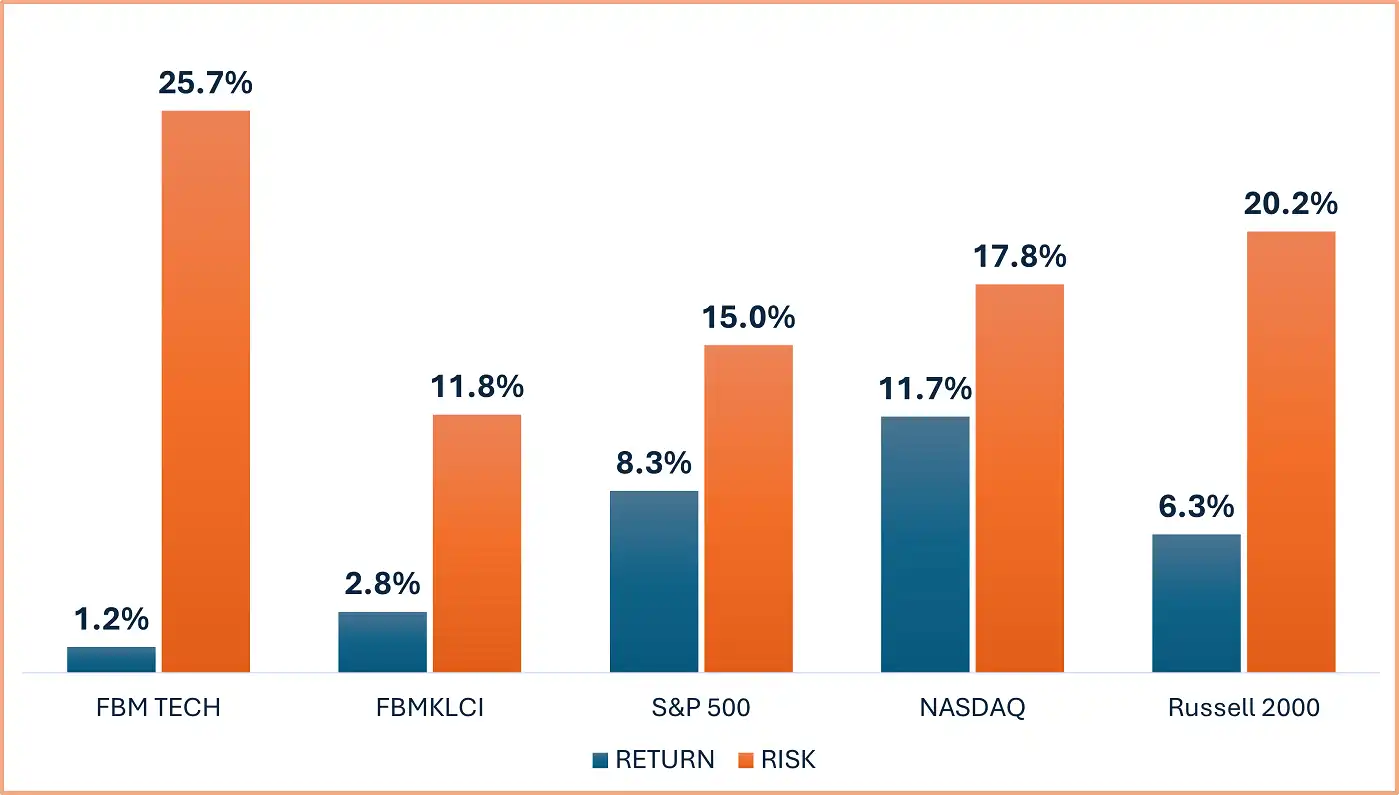 Beyond returns, risk is another critical factor investors must consider. We analysed risk using standard deviation, a commonly used measure of the volatility of financial instruments. Malaysian tech stocks exhibit alarming volatility, with a standard deviation of 25.7%—more than twice that of the broader Malaysian market (11.8%). Surprisingly, they are even riskier than US small-cap stocks, which are typically known for their volatility. For reference, the S&P 500’s volatility stands at 15%, the Nasdaq Composite at 17.8%, and the Russell 2000 at 20.2%. This means Malaysian investors are taking on significantly more risk while receiving far lower returns.