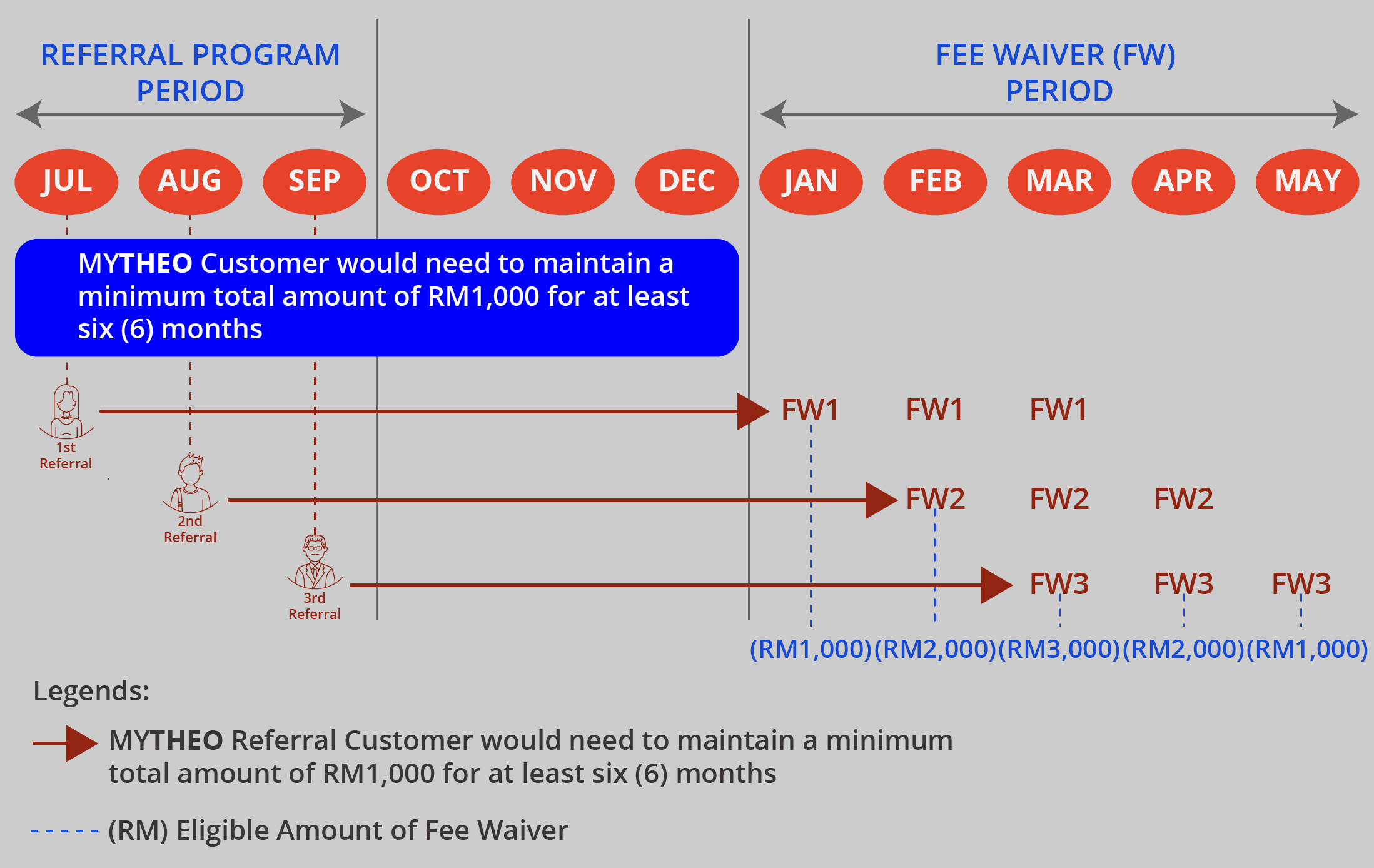 6. To be eligible for the Fee Waiver, MYTHEO Customers and MYTHEO Referral Customers would need to maintain a minimum total amount of RM1,000 for at least six (6) months.