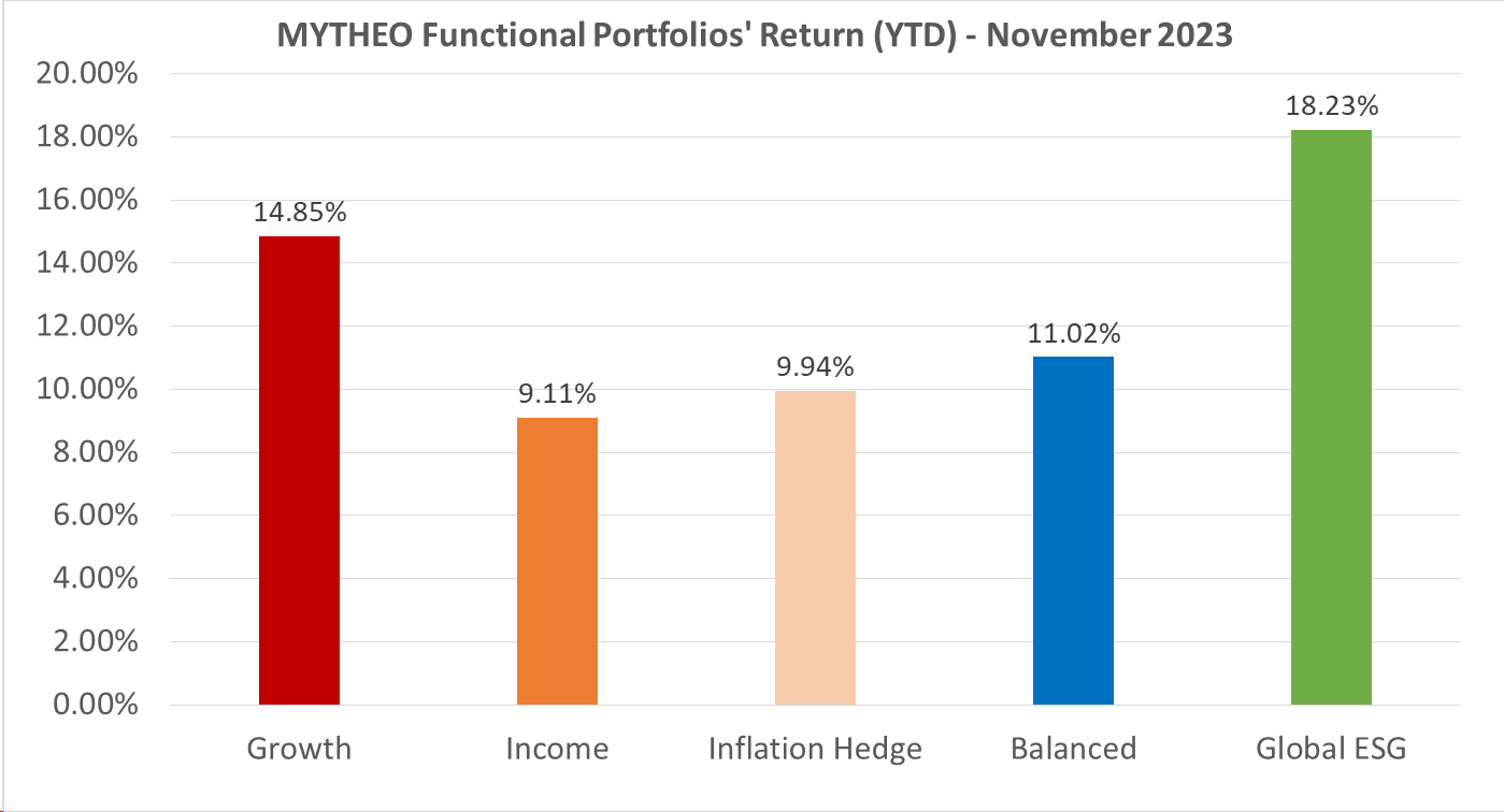 In this monthly report, we will review MYTHEO’s portfolio performances based on financial market developments in November 2023.