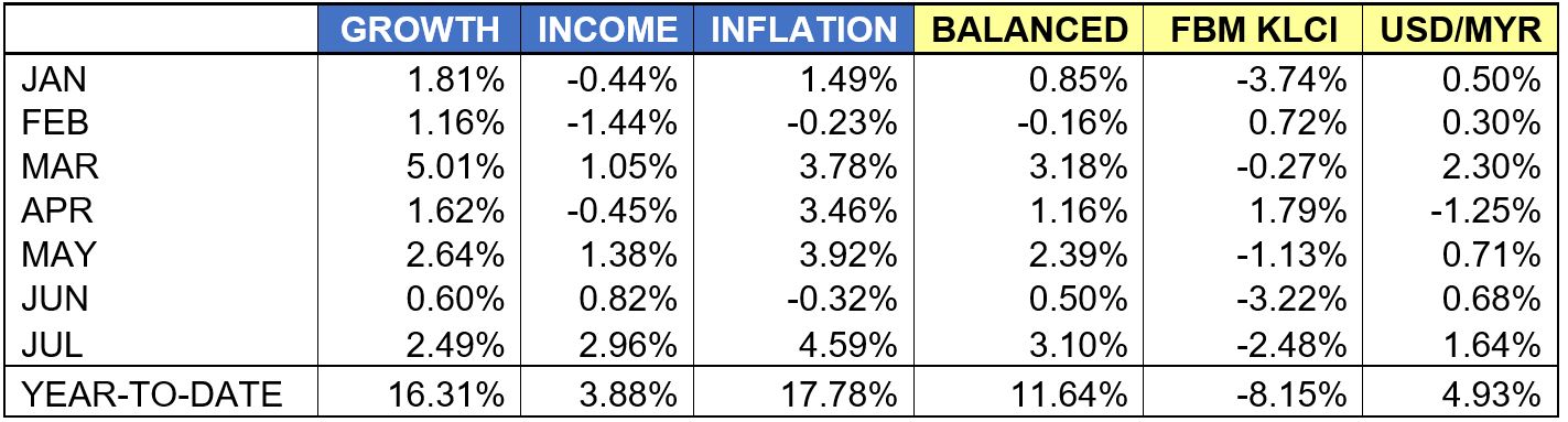 For those who invested in a balanced portfolio with a 40%:40%:20% allocation in Growth, Income and Inflation Hedge portfolios, the return should be 11.64%. In comparison, the FBM KLCI had a negative return of 8.15% over the same period.