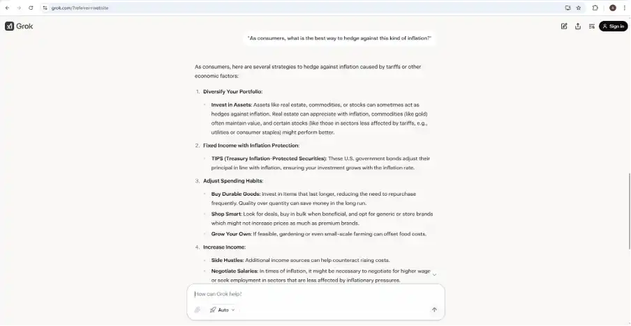 Grok AI’s answers on tariffs , which are in line with most of the views of the economists and market analysts , confirmed that President Trump is wrong. Grok AI also agreed with us that tariffs drive up the cost of imported goods and fuel inflation. What’s even more compelling is Grok AI advice on hedging against inflation, which aligns perfectly with the assets inside the MYTHEO Inflation Hedge Portfolio.